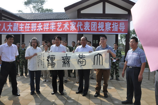 6月3日上午,四川省人大副主任郭永祥率藝術(shù)家代表團(tuán)赴北川新縣城慰問援建士。藝術(shù)家們或現(xiàn)場(chǎng)作畫,或引亢高歌,或與援川員工同臺(tái)表演,真誠(chéng)表達(dá)他們對(duì)山東人民援川的感激之情。集團(tuán)公司援川員工還為藝術(shù)家代表團(tuán)合唱《援川之歌》。慰問演出前,郭永祥副主任還視察了集團(tuán)公司援建的安居房工程,藝術(shù)家們還實(shí)地參觀了新的安居房家居,看到漂亮、舒適的安居房,聽著援川人的感人事跡,藝術(shù)家們表達(dá)了對(duì)援川將士的由衷贊嘆,并再一次代表北川縣的受災(zāi)同胞對(duì)山東的援建表示真誠(chéng)的謝意。 ![]() 圖為藝術(shù)家展示藝術(shù)作品