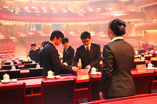 由于本次會議市政府要求不安排專業(yè)禮儀公司承接,這樣會務的服務接待任務也全部落在了公管公司。為做好會議接待服務工作,從2012年12月中旬開始,公管公司挑選了35名人員并聘請專業(yè)講師進行培訓。除此之外,公管公司執(zhí)行董事李坤明親率公管公司領導班子成員和員工全面投入會務保障工作。會務期間,投入保潔75人,保安42人,接待35人,消防18人,電力保證12人,物資保障20人,制作安裝宣傳標語和引導牌200多塊,擺放花卉200多盆,鋪設地毯3341 平方米,調(diào)用桌子180張,椅子250把,沙發(fā)15套,各類會議用品30多個品種。全面、高效、順利完成了對本次會議的保障工作。