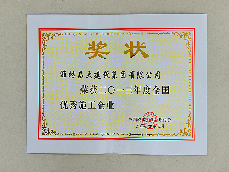 2014年4月18日,中國施工企業(yè)管理協(xié)會第29次年會暨2014年中國施工裝備展覽洽商會在南京召開。會上,對2013年度全國優(yōu)秀施工企業(yè)進(jìn)行了表彰(人民日報第24008期公示)。集團(tuán)公司榮獲2013年度全國優(yōu)秀施工企業(yè)稱號。