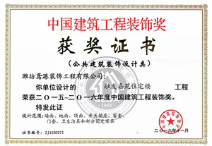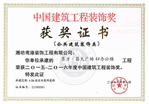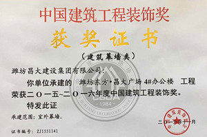 2016年12月23日,2015-2016年度中國建筑工程裝飾獎頒獎大會在北京國際會議中心舉行。集團(tuán)再獲四個裝飾獎,分別是:裝飾幕墻公司施工的東方?昌大廣場4#辦公樓工程榮獲幕墻類裝飾獎;鳶港裝飾公司施工的東方?昌大廣場4#辦公樓榮獲公共建筑裝飾類裝飾獎;鳶港裝飾公司施工的融發(fā)嘉苑住宅樓工程榮獲公共建筑裝飾類裝飾獎;鳶港裝飾公司施工的融發(fā)嘉苑住宅樓工程還獲得公共建筑裝飾設(shè)計類裝飾獎。 中國建筑工程裝飾獎是全國建筑裝飾行業(yè)的最高榮譽(yù),由中國建筑裝飾協(xié)會主辦,每年評選,每兩年表彰一次。兩個年度、一個表彰周期實現(xiàn)四個裝飾獎,這是“昌大裝飾”品牌的力量,也是濰坊昌大建設(shè)集團(tuán)逐步實施的“工程全優(yōu)”、“建筑讓生活更美好”理念的現(xiàn)實寫照。