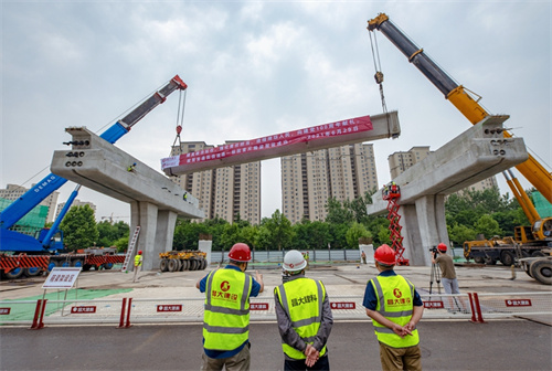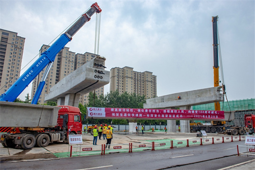 熱烈祝賀集團(tuán)寶通街快速路工程第一片預(yù)制箱梁順利吊裝完成