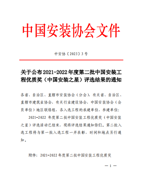 集團(tuán)公司再創(chuàng)一個(gè)國家級(jí)安裝工程質(zhì)量最高獎(jiǎng)——安裝之星