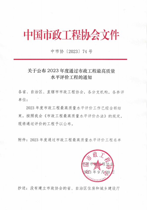集團榮獲2023年度市政工程最高質量水平評價工程獎