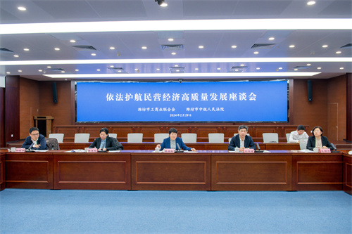2024年2月29日上午,濰坊市依法護(hù)航民營經(jīng)濟(jì)高質(zhì)量發(fā)展座談會在濰坊市中級人民法院會議室召開。市政府副市長、市工商聯(lián)主席陳端梅,市委統(tǒng)戰(zhàn)部副部長、市工商聯(lián)黨組書記劉興成,市工商聯(lián)黨組成員副主席譚述霞出席會議。市委政法委、市工商聯(lián)相關(guān)工作人員,商會會長代表、企業(yè)家代表、民營企業(yè)法務(wù)中心代表參加會議。集團(tuán)公司總裁朱九洲出席會議并作交流發(fā)言,代表企業(yè)家感謝市中院及法院系統(tǒng)在依法護(hù)航企業(yè)發(fā)展過程中給予的支持,同時建議法院系統(tǒng)繼續(xù)依法對民營企業(yè)提供法律保護(hù)等。