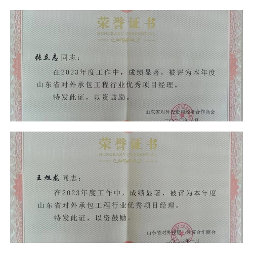2024年3月12-13日,山東省對外投資與經(jīng)濟合作商會舉行行業(yè)發(fā)展交流大會,并對2023年度商會先進單位和個人進行表彰,集團獲“二〇二三年度山東省對外承包工程行業(yè)先進單位”榮譽稱號,海外公司張立志、王旭龍獲“山東省對外承包工程行業(yè)優(yōu)秀項目經(jīng)理”榮譽稱號。